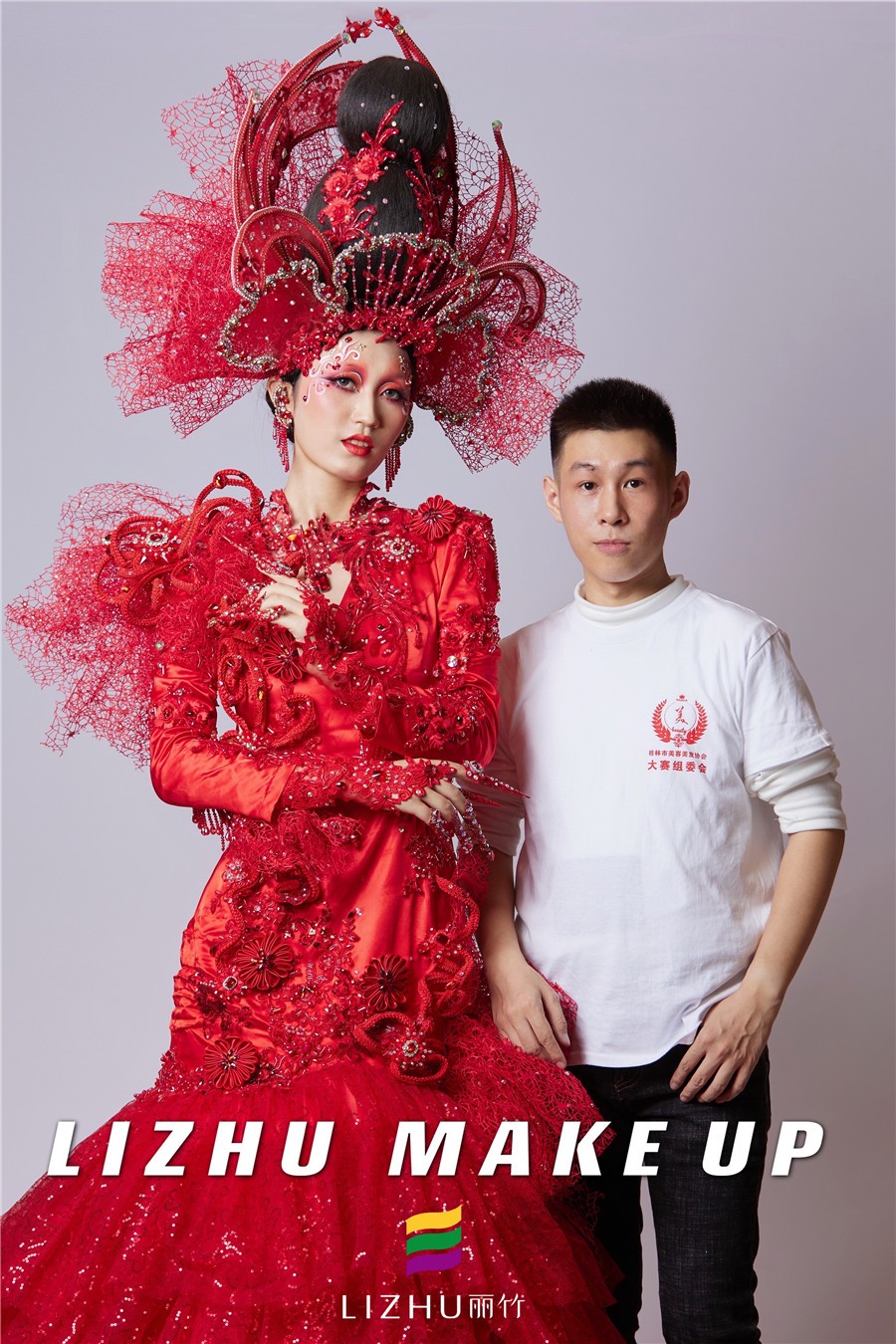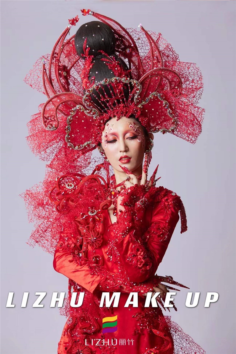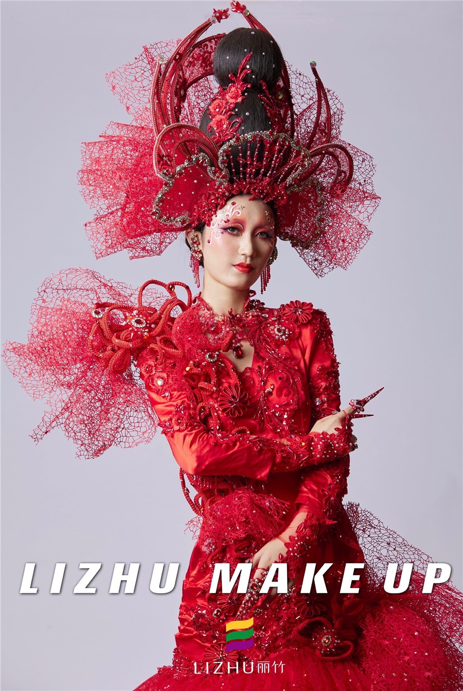 南寧創(chuàng )意造型培訓學(xué)校創(chuàng )意彩妝作品---戰姬:這款整體造型以“中國紅”為主色,修身的魚(yú)尾裙擺設計配以水鉆、刺繡和精致的頭飾,妝面以紅色為主,運用簡(jiǎn)單線(xiàn)條描繪以及大面積暈染的手法處理,妝面與服裝、頭飾相呼應,視覺(jué)沖擊十足。