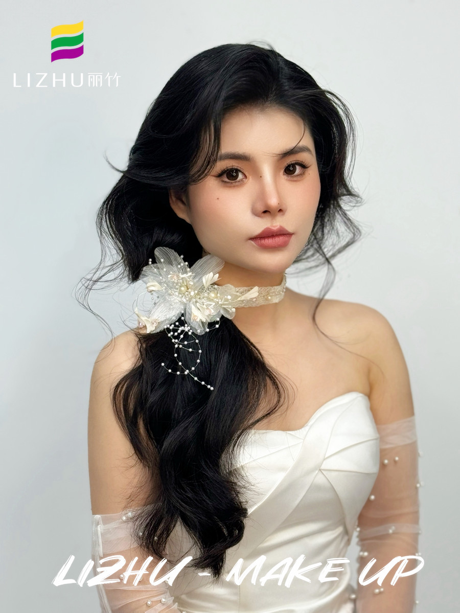 廣西學(xué)化妝影樓、廣西寫(xiě)真化妝,廣西新娘妝跟妝培訓(麗竹寫(xiě)真化妝培訓)--- 韓式側扎紋理新娘:氧氣清新的自然無(wú)痕妝容,優(yōu)雅隨意的紋理韓式卷發(fā),白色蕾絲珠花頭飾側扎發(fā),打造氣質(zhì)滿(mǎn)滿(mǎn)的元氣美少女。