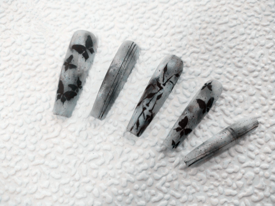 使用乳白色彩繪膠打底,蘸取黑色甲油膠在甲面上隨意鋪展開(kāi),然后在慢慢進(jìn)行自然過(guò)渡的暈染,打造色彩在水面暈開(kāi)的感覺(jué)。之后在用彩繪筆畫(huà)出黑色蝴蝶圖案及其他點(diǎn)綴圖案,蕞后涂上磨砂封層,使得整副作品的圖案更加逼真,蝴蝶仿馬上就要翩翩起舞,看起來(lái)很有靈氣。同時(shí)也將經(jīng)典的文雅氣韻躍于“指”上。