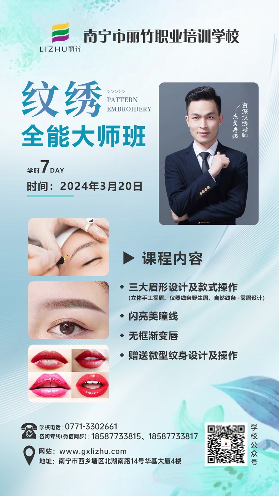 廣西紋繡、廣西紋繡進(jìn)修:廣西南寧紋繡職業(yè)學(xué)校將在3月20日進(jìn)行廣西眉眼唇培訓班(麗竹紋繡大師班)培訓課程。行業(yè)紋繡導師(杰文老師)手把手,一對一全程指導,學(xué)習席位備受歡迎,如果不想錯過(guò)此次課程,趕緊聯(lián)系我們報名吧!